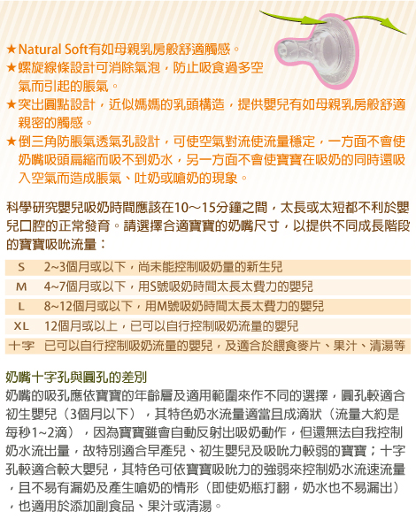 ★倒三角防脹氣透氣孔設計,可使空氣對流使流量穩定,一方面不會使奶嘴吸頭扁縮而吸不到奶水,另一方面不會使寶寶在吸奶的同時還吸入空氣而造成脹氣、吐奶或嗆奶的現象。