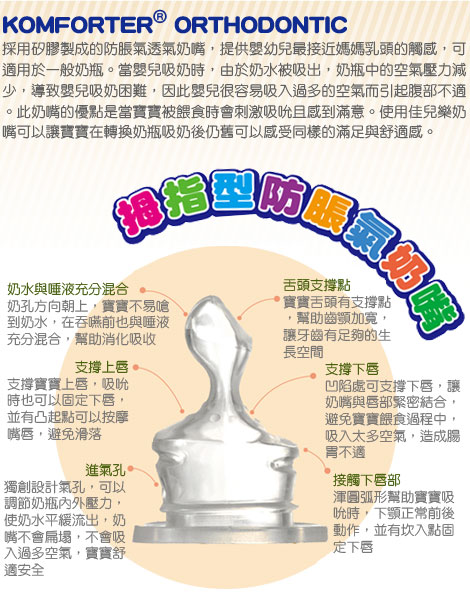 ★拇指型奶嘴設計,可防止寶寶吸食過多空氣而引起的脹氣
